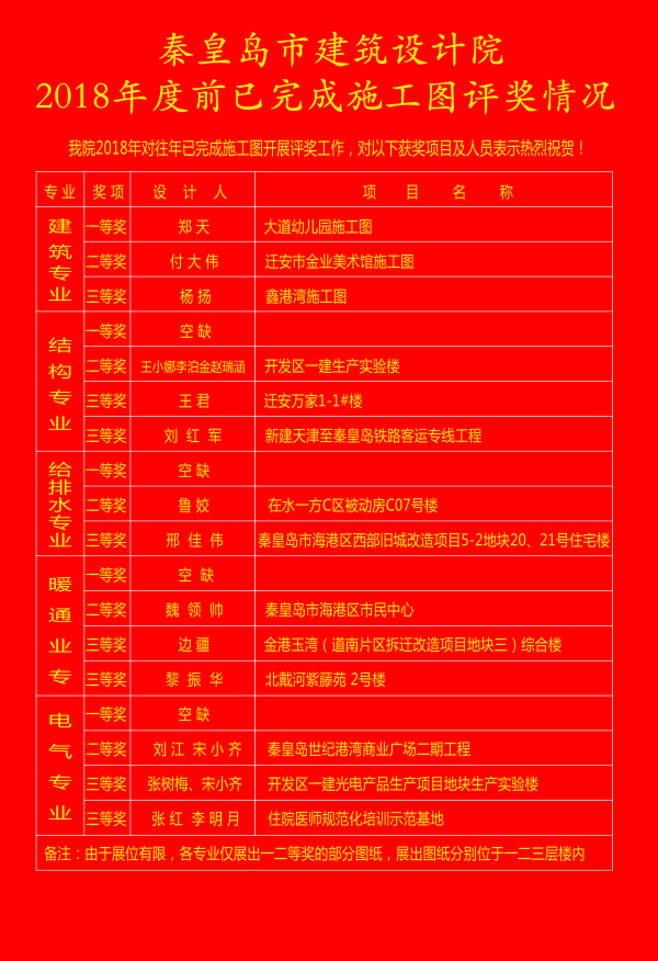 截止到2018年3月5日,活動(dòng)最終按照各專業(yè)分別評(píng)選出了一、二、三等獎(jiǎng),評(píng)選結(jié)果和獲獎(jiǎng)的優(yōu)秀施工圖分別在大堂進(jìn)行了公示。